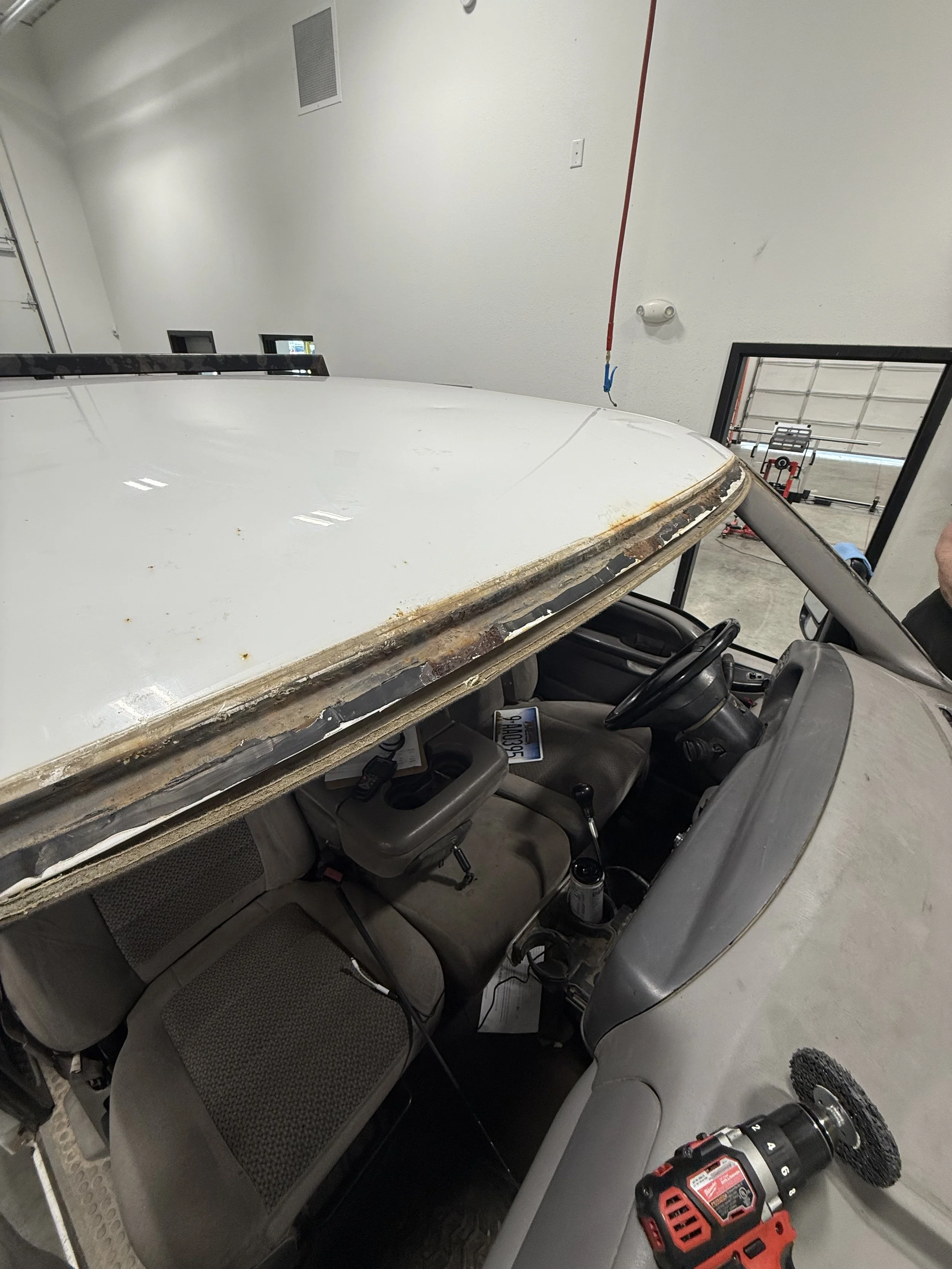 Came in for a Windshield Replacement and had some paint failure in the pinch weld. Had to grind it down to metal and execute the rust.
